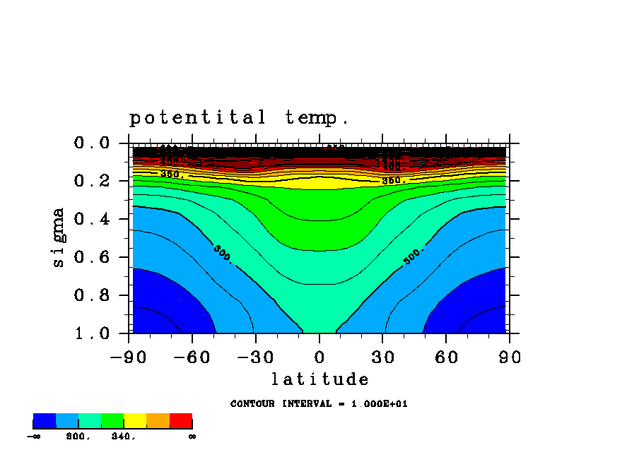 温度 + (u, -SigDot) の (x,z) 断面 at 赤道