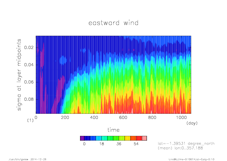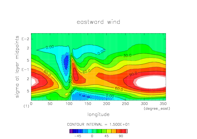 東西風. 赤道断面 (鉛直座標は対数プロット) |