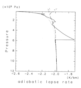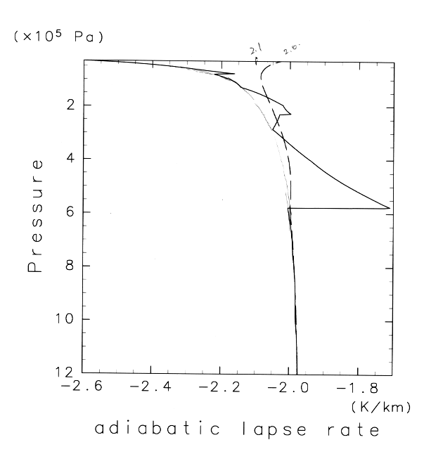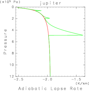 それぞれの場合について木星大気の断熱減率の計算例を以下に示す. 数値微分は誤差がでやすいためにエントロピーがうまく保存されず, 結果として断熱温度減率(エントロピー保存の下での温度減率)が変に「がたつく」ことが見て取れる.